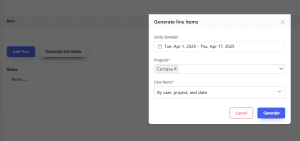 You can generate invoice line items manually by adding them individually, or click «Generate line items». If you click generate line items, you can select date range, projects and grouping type: